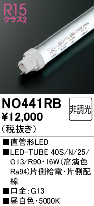 | 製品名: | NO441RB オーデリック G13直管LED光源 40W形 2500lmタイプ 高演色 片側給電・片側配線 色温度5000K(昼白色) |